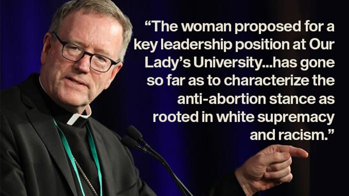 “The woman proposed for a key leadership position at Our Lady’s University is not simply “pro-choice” on the question of abortion; she is a sharp critic of the pro-life position and those who advocate it. She has gone so far as to characterize the anti-abortion stance as rooted in white supremacy and racism”